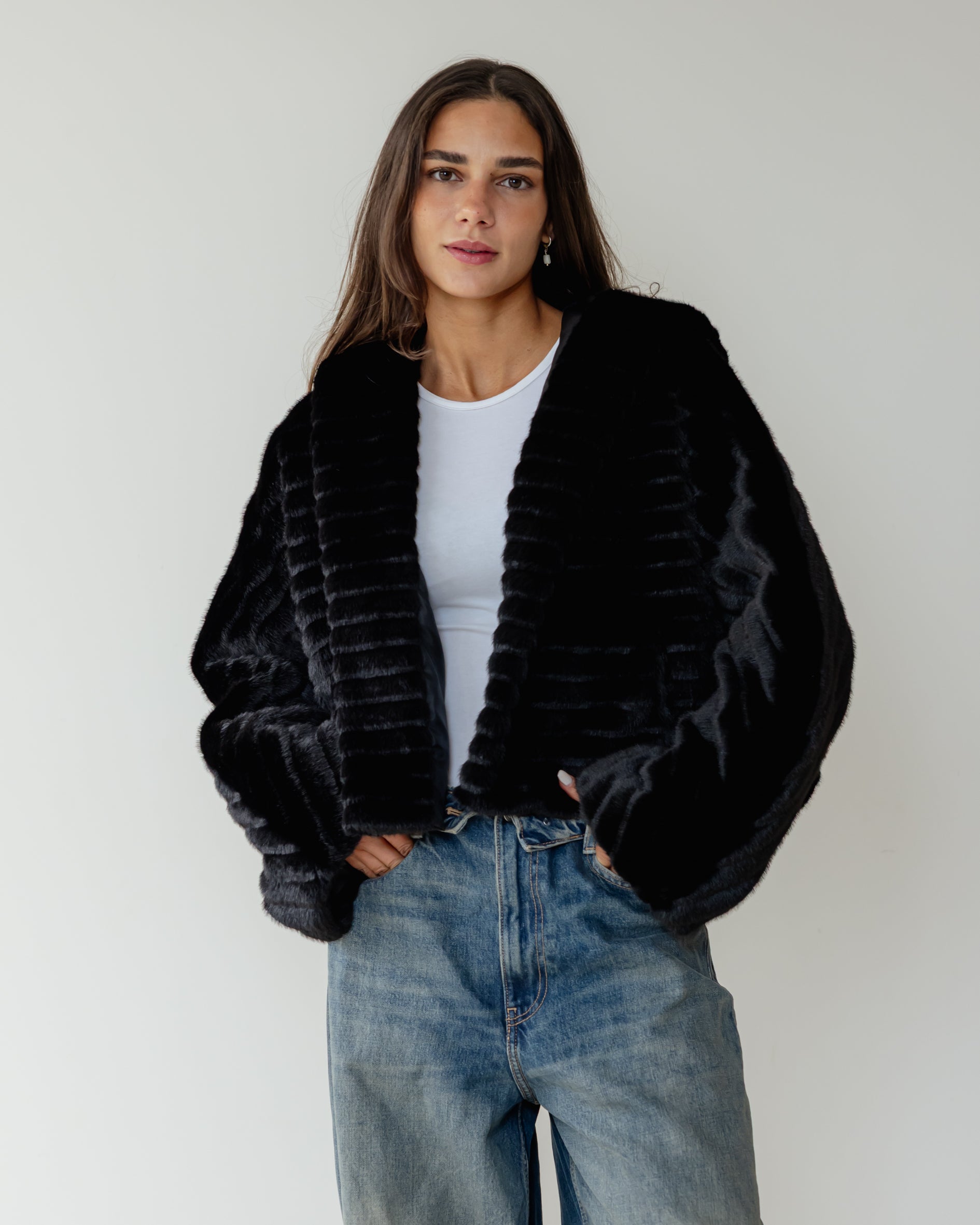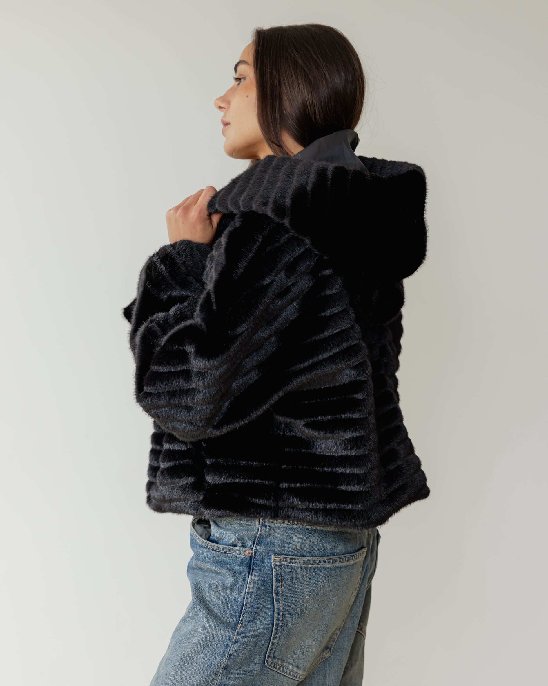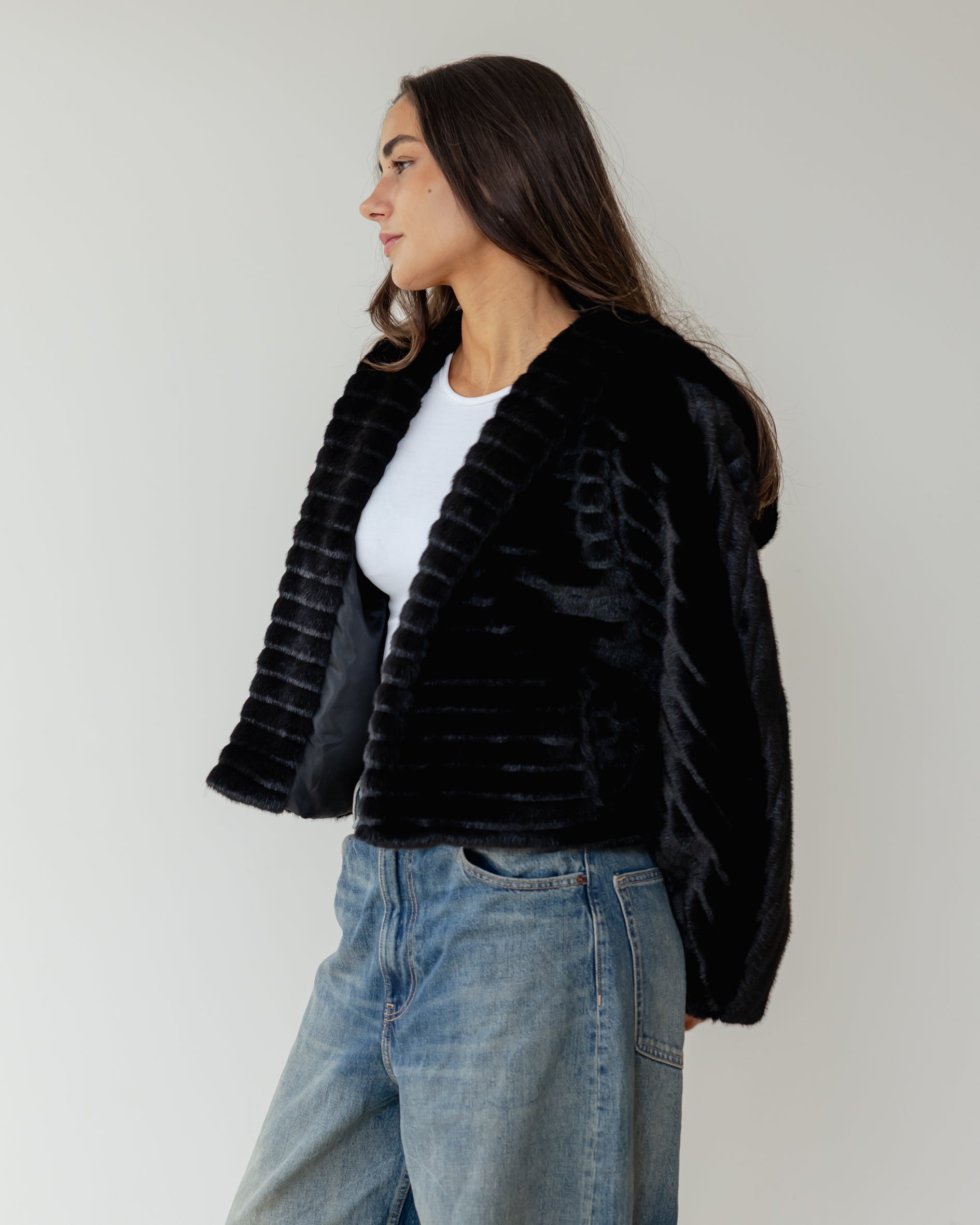 Ribbed Faux Fur Jacket - Black