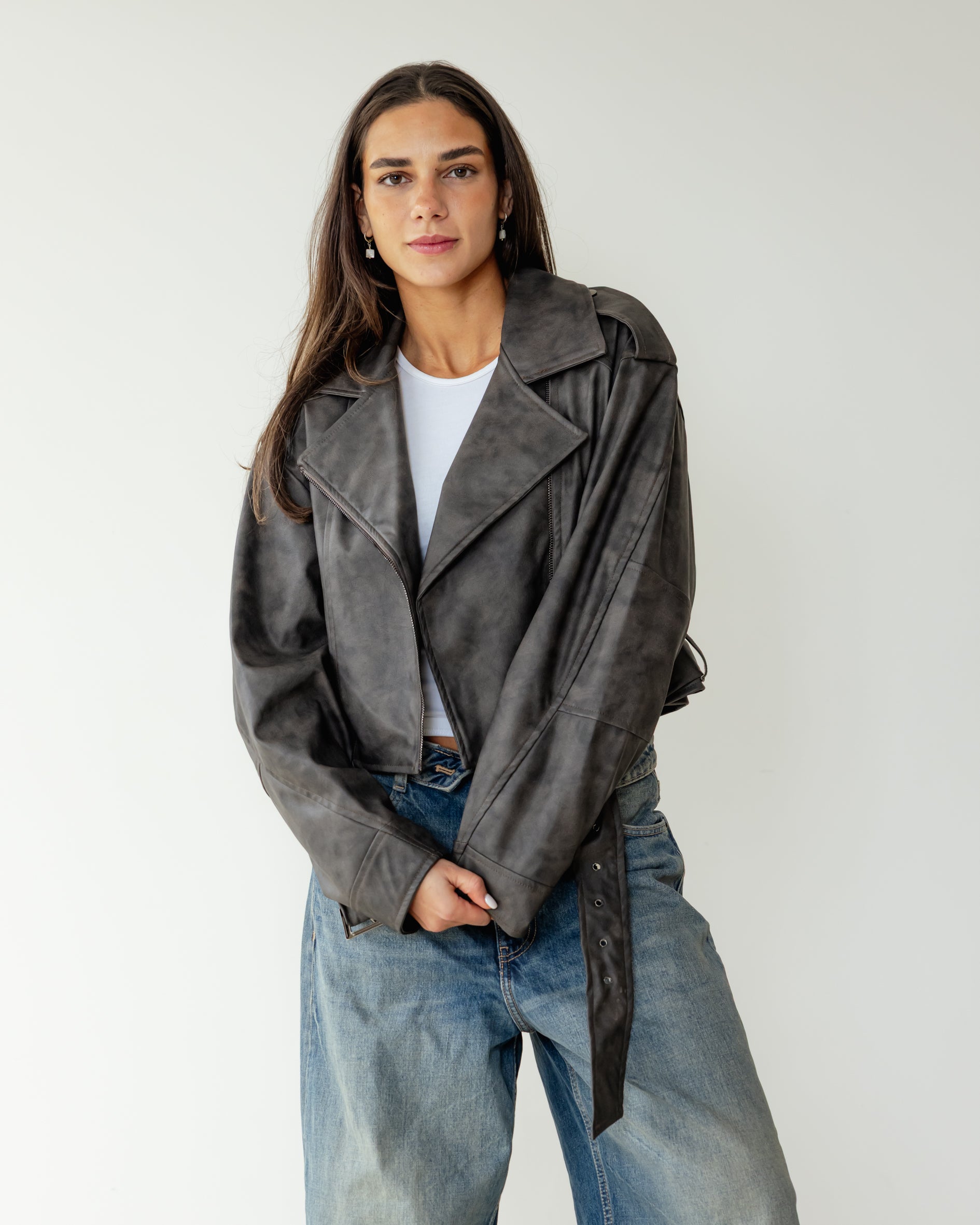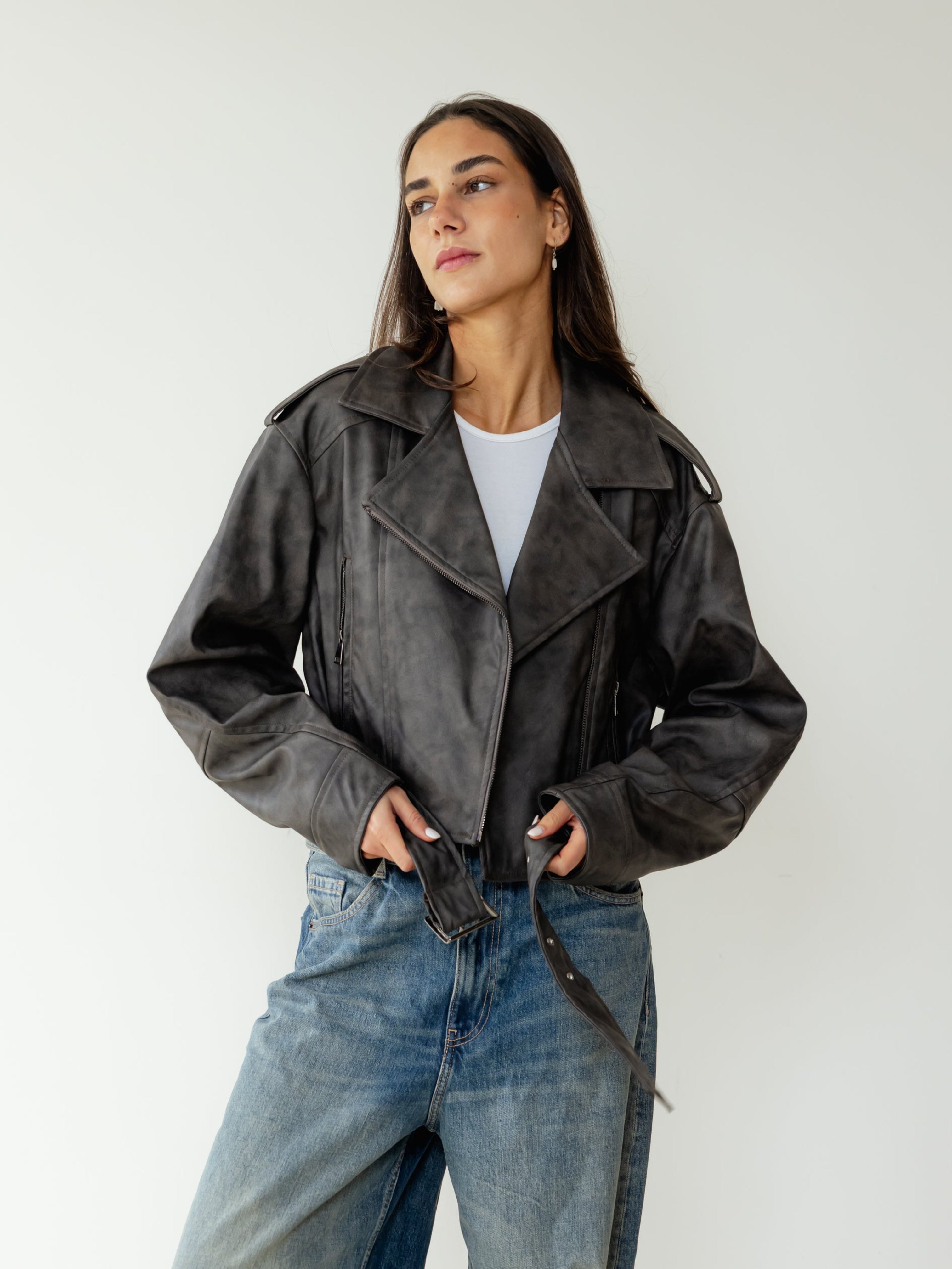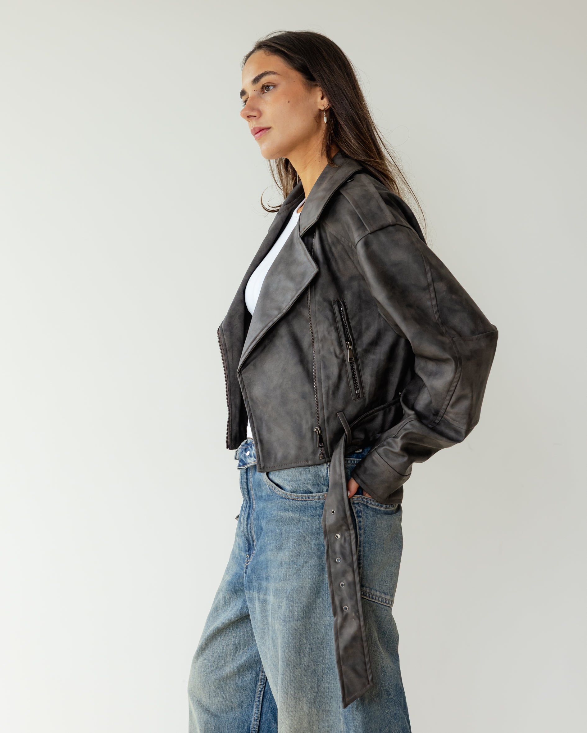 Leather Effect Biker Jacket - Grey