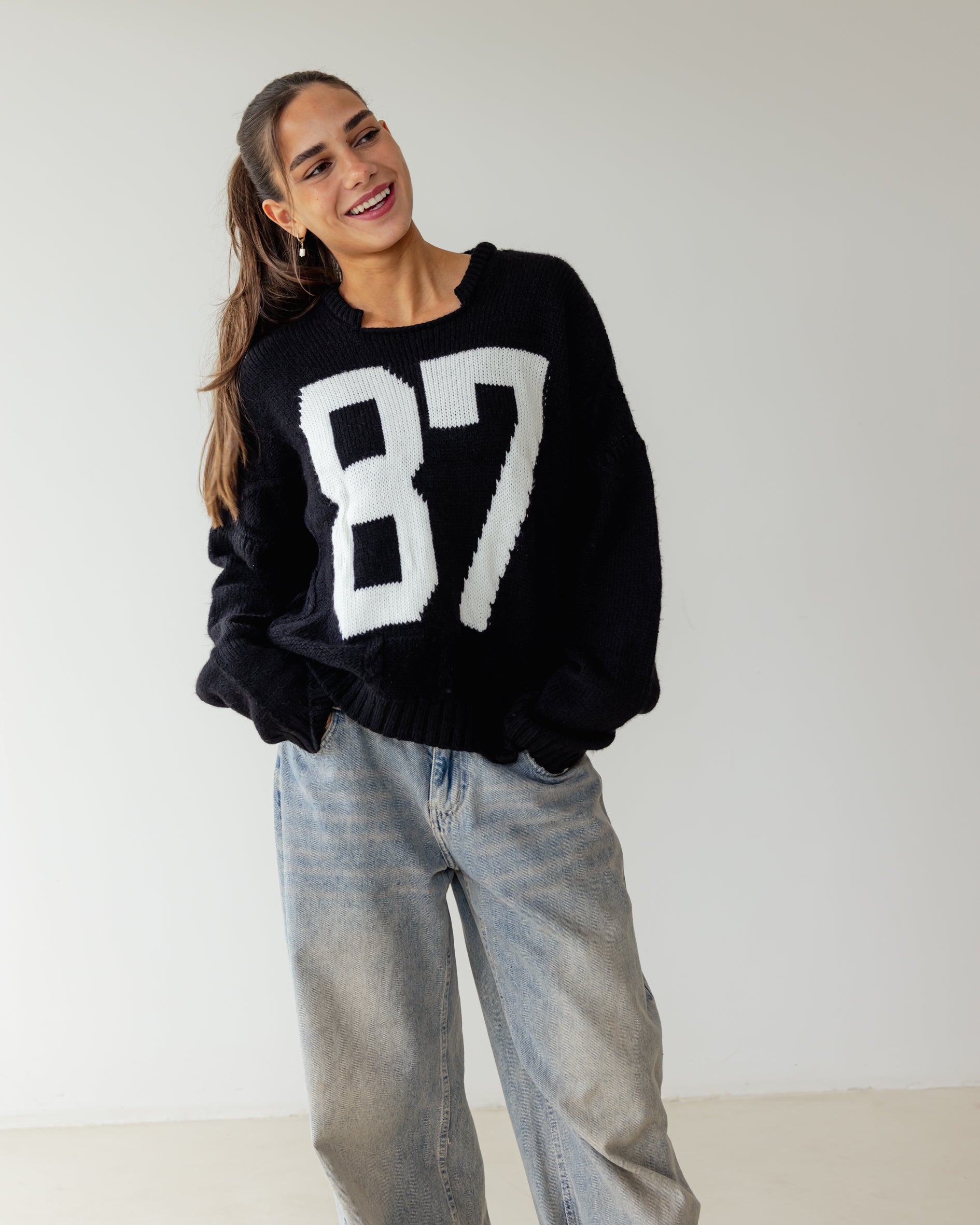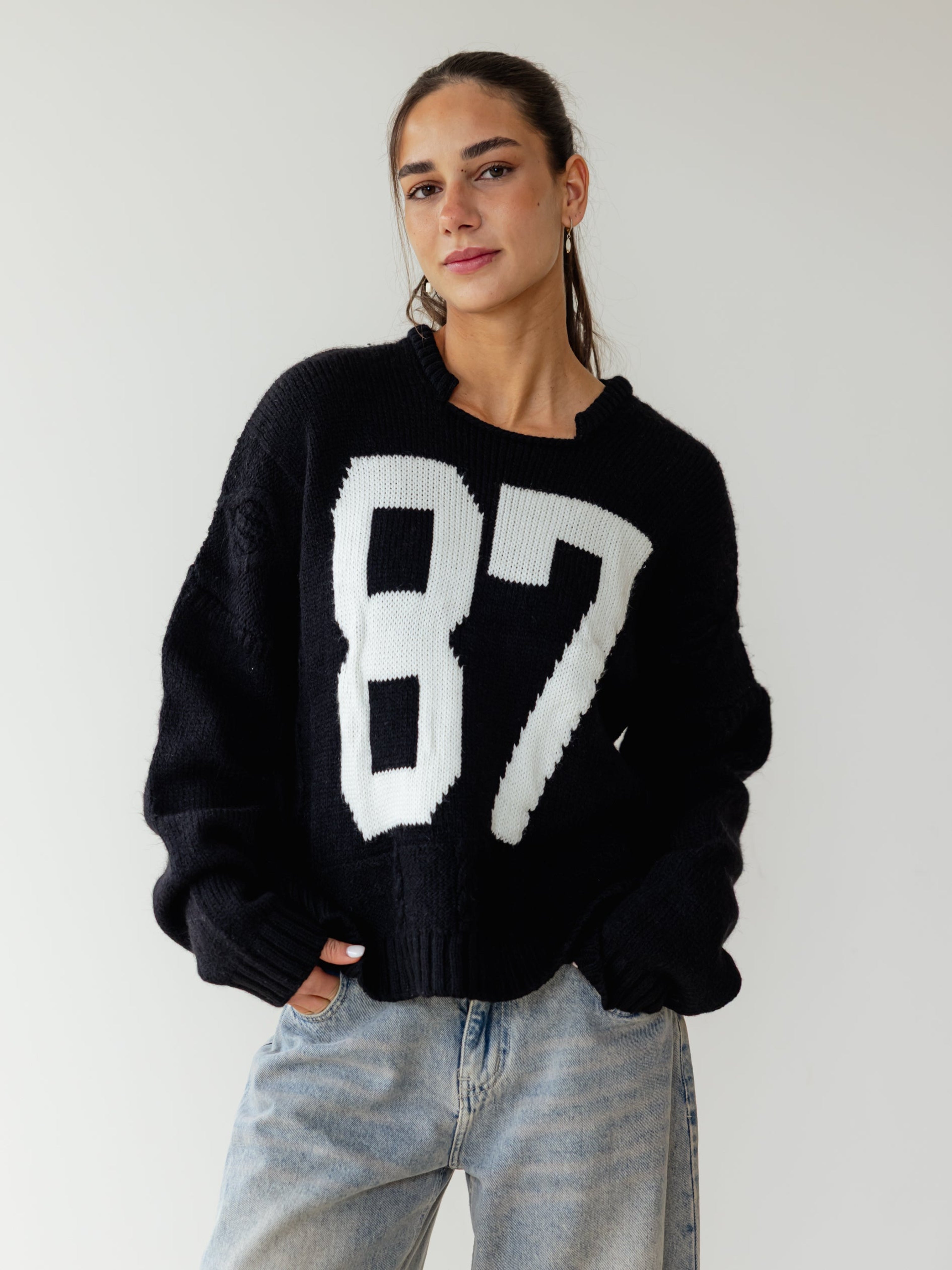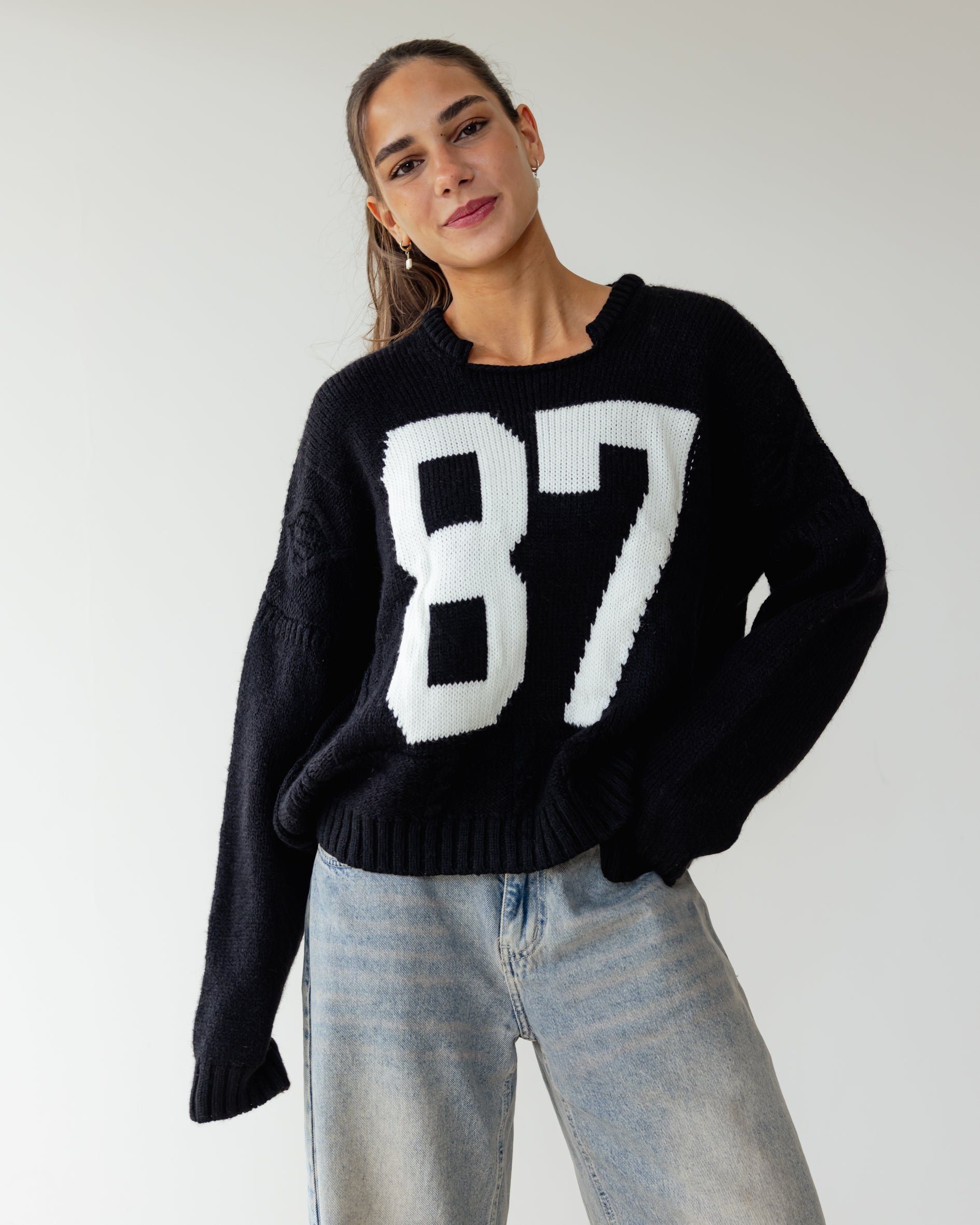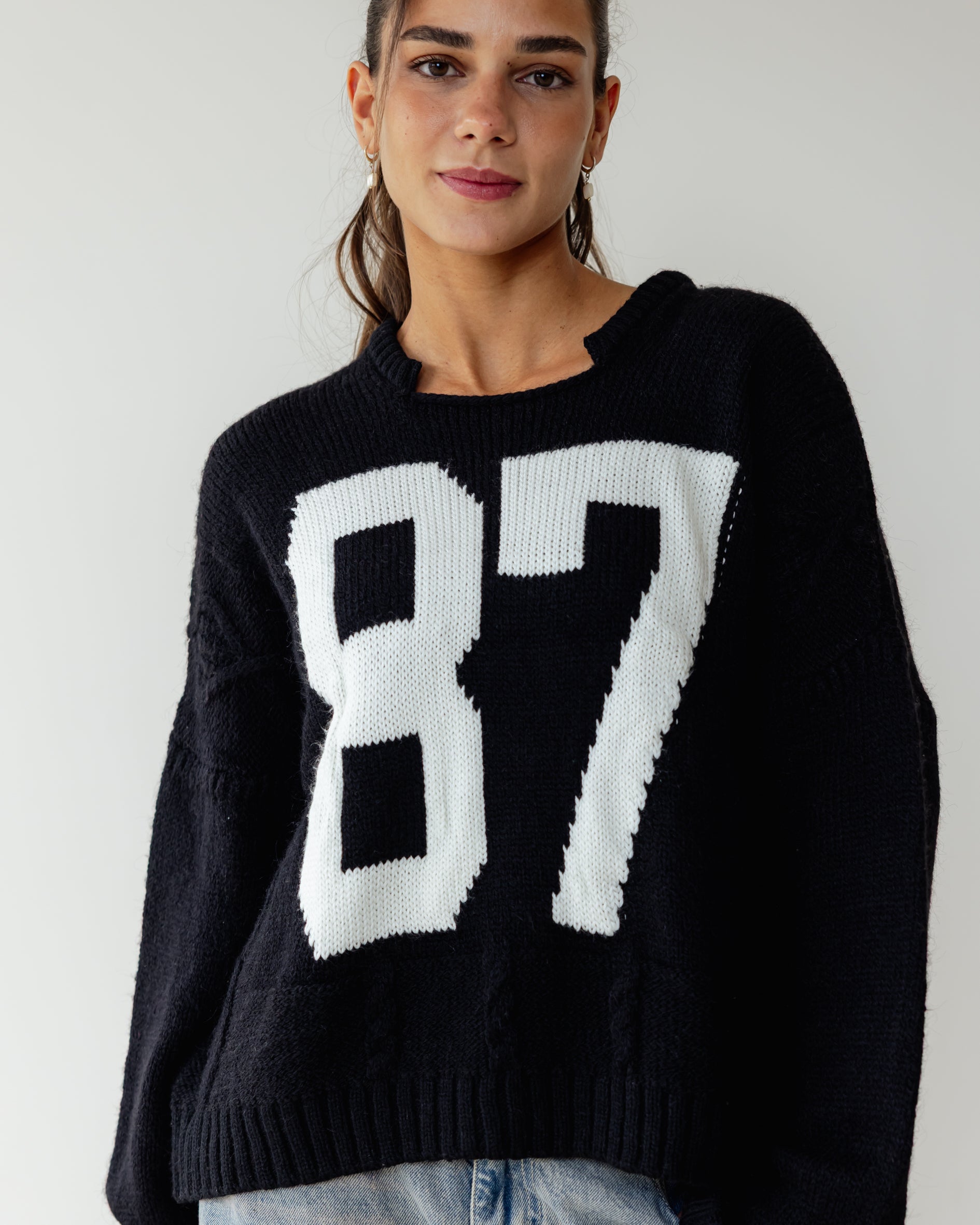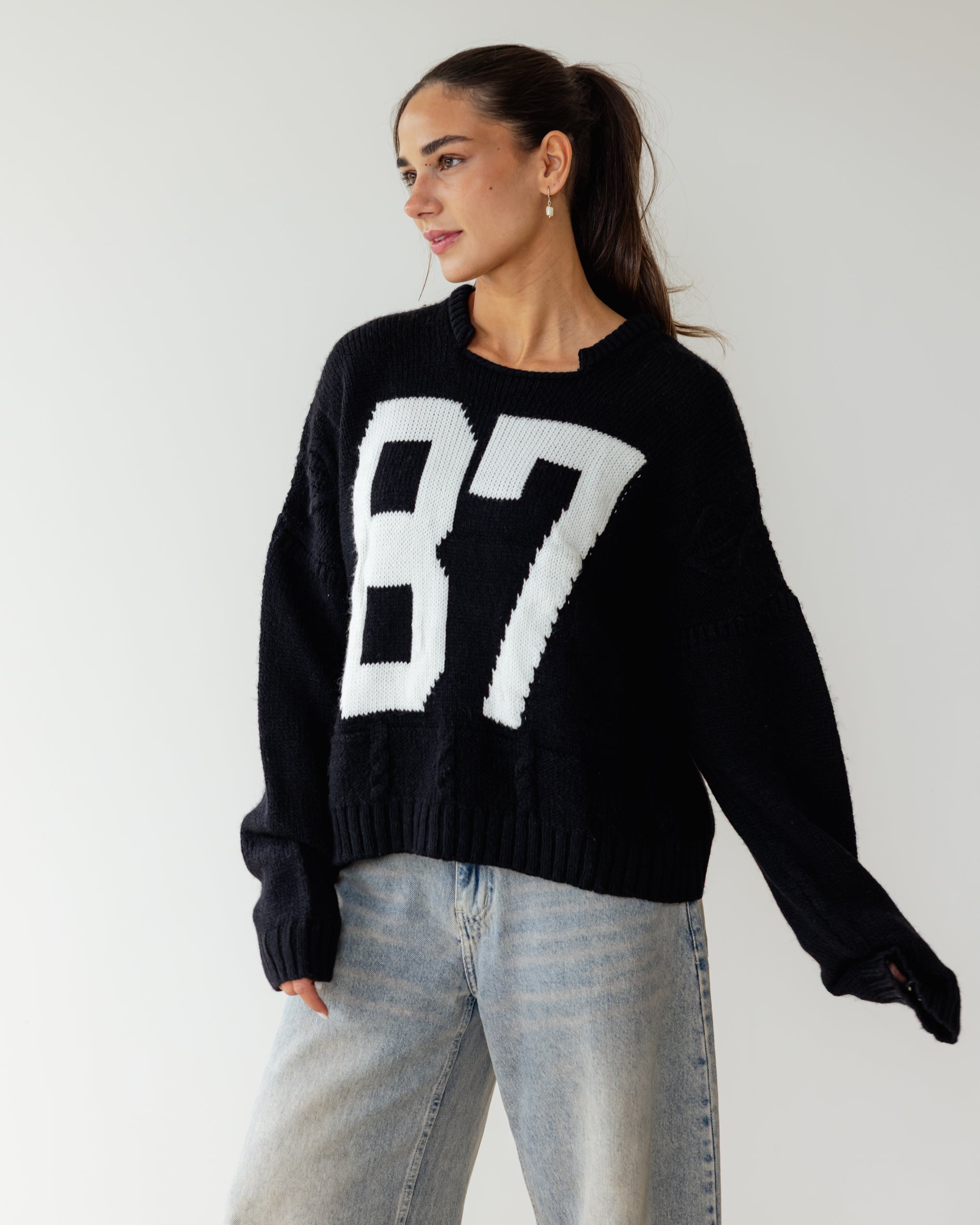Too-cool in cable knit, A soft knit fabrication and slouchy silhouette with oversized number detail and drop-shoulder sleeves.